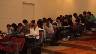En la tercera y cuarta foto, se ve el númeroso grupo (52) de estudiantes universitarios inscritos al curso "Salud, cultura y persona" primer semestre 2011. Es el tercer año que se dicta este curso y ya 21 alumnos se han entusiasmado para hacer todo el certificado academico sobre "Humanización de la salud" de la Pontificia Universidad Católica de Chile. Algo absolutamente nuevo en Chile (¡y no sólo!): la humanización de la salud a nivel académico, científico y... católico.